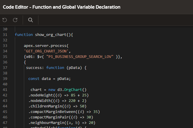 With D3.js, you can build highly interactive, vector-based charts with zoom and pan functionality — perfect for complex hierarchical data like org charts. In this post, I’ll walk you through how to integrate D3.js into Oracle APEX, generate the necessary JSON payload using PL/SQL, and deliver the data to your JavaScript chart.